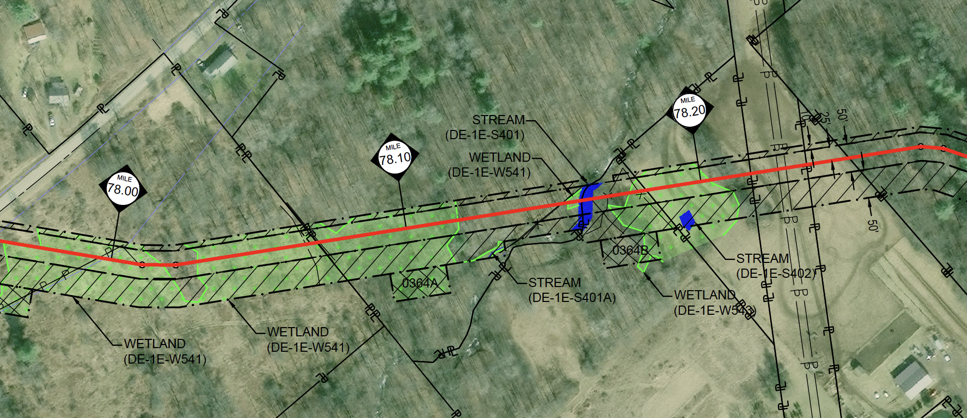 Attachment F (9 documents) which has construction plans on aerial imagery showing the pipeline route, temporary work zones, wetlands delineations, etc.